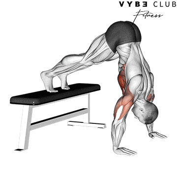 Set Up: Start by placing your hands on the floor, shoulder-width apart, and your feet on a bench, keeping your legs straight. Your body should form an inverted "V" shape with your hips raised high.
