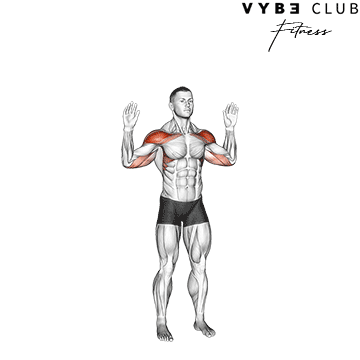 Raise arms to shoulder height, elbows bent at 90 degrees, palms forward. Press hands overhead, extending arms fully. Lower slowly back to starting position.