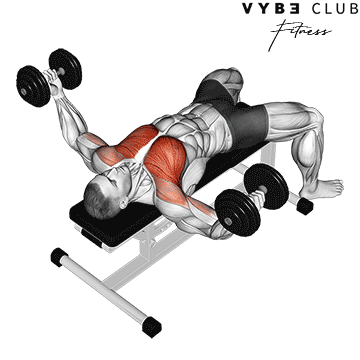 Set Up: Lie flat on a bench with your feet planted firmly on the floor. Hold a dumbbell in each hand with your arms extended directly above your chest, palms facing each other, and a slight bend in your elbows.
