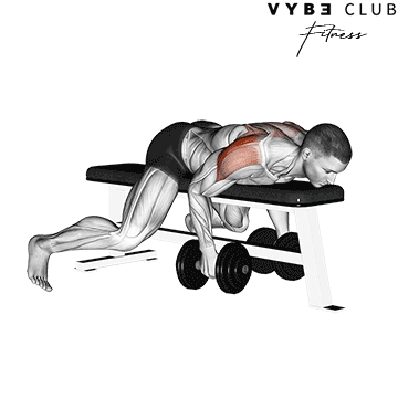 Set Up: Lie face down on a flat bench with your chest supported and your arms hanging straight down, holding a dumbbell in each hand.