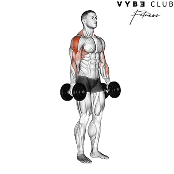 Starting Position: Stand with your feet shoulder-width apart, holding a dumbbell in each hand with your arms straight by your sides. Keep your elbows slightly bent at the start.