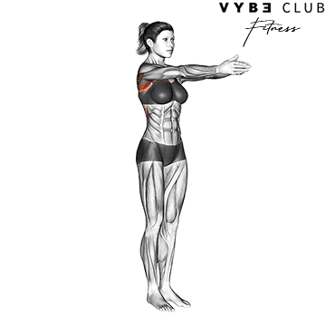 Stand with your feet shoulder-width apart, knees slightly bent, and arms extended straight out in front of you at shoulder height.