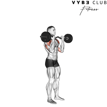 - Starting Position: Hold the bar at shoulder height, elbows bent at a 90-degree angle, and keep your chest lifted.