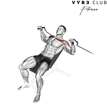 Position the cable pulleys on a cable machine at the lowest setting and attach single handles to each pulley. Adjust the bench to a slight incline (around 30–45 degrees) and sit with your back resting on the bench. Grasp the handles with a neutral grip (palms facing forward).