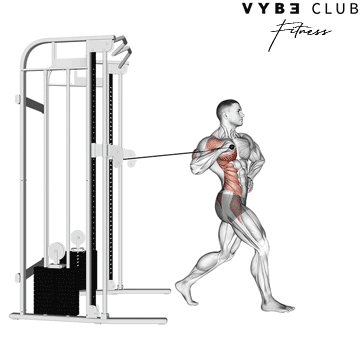 Set the cable handle to chest height. Step forward with one foot, feet shoulder-width apart. Grab the handle with one hand and bring it to your chest.