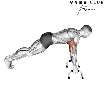 The push-up with push-up bars increases the range of motion compared to regular push-ups, allowing for a deeper stretch in the chest and greater activation of the muscles. It targets the chest, shoulders, and triceps while improving wrist comfort due to the neutral hand position. This variation enhances upper body strength and stability, and can be beneficial for those looking to build muscle mass or improve push-up form.