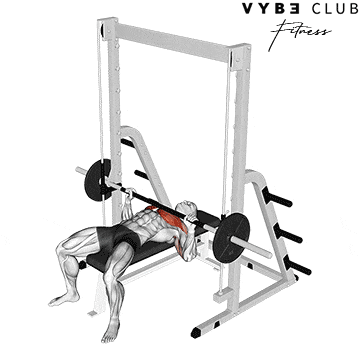 Position a flat bench under the Smith Machine. Adjust the bar height so you can comfortably unrack it with your arms extended. Lie on the bench with your feet flat on the floor and grip the bar slightly wider than shoulder-width, palms facing forward.