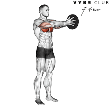 Hold a single weight plate with both hands, pressing it between your palms at chest height. Your elbows should be bent, and the plate should rest close to your chest. Stand with your feet shoulder-width apart, engaging your core.