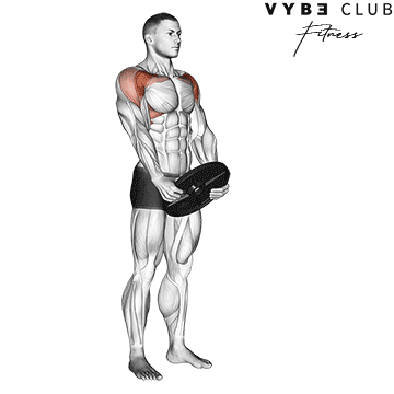 The weight plate front raise primarily targets the front deltoid muscles (shoulders), helping to increase shoulder strength and definition. This exercise also engages the upper chest and traps, promoting overall upper body development. By using a plate, you can challenge your grip strength and enhance forearm endurance. The controlled motion ensures better muscle activation, helping with shoulder stability and reducing the risk of injury. Additionally, the front raise can improve posture by strengthening the muscles that support shoulder and upper body alignment.
